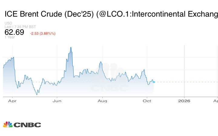 انخفضت العقود الآجلة لخام برنت 2.53 دولاراً، أو 3.88%، لتبلغ عند التسوية إلى 62.69 دولاراً للبرميل.