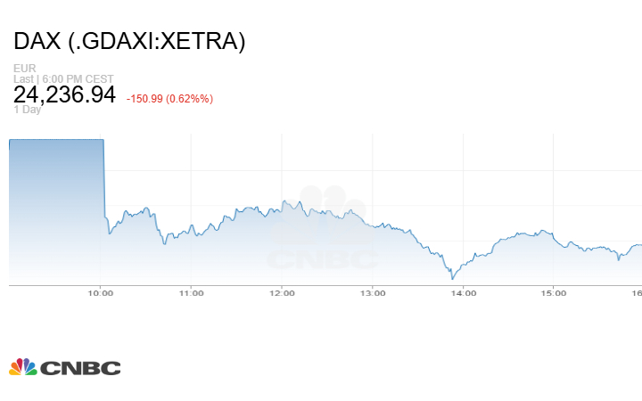 كما أغلق مؤشر DAX الألماني الجلسة على هبوط 150.99 نقطة أو بنسبة 0.62% إلى مستوى 24236.94 نقطة، بعد أن سجل أدنى مستوى له في أسبوعين.