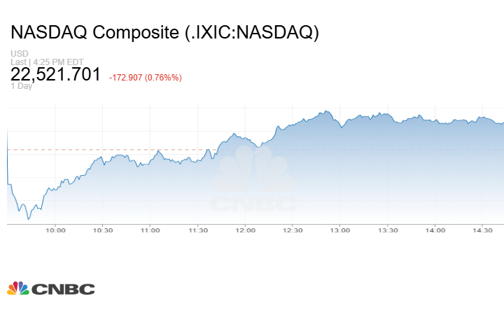 وتراجع مؤشر Nasdaq المركب عند الإغلاق بنحو 172.91 نقطة أو بنسبة 0.76% إلى 22521.70 نقطة.