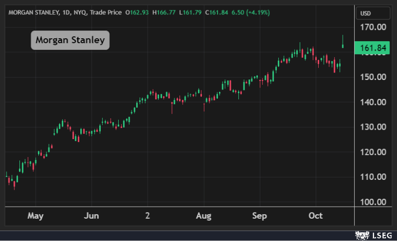 ارتفع سهم Morgan Stanley بنحو 5% في جلسة الأربعاء مسجلاً إغلاقاً قياسياً جديدا، ليضيف البنك نحو 12 مليار دولار إلى قيمته السوقية في يوم واحد.