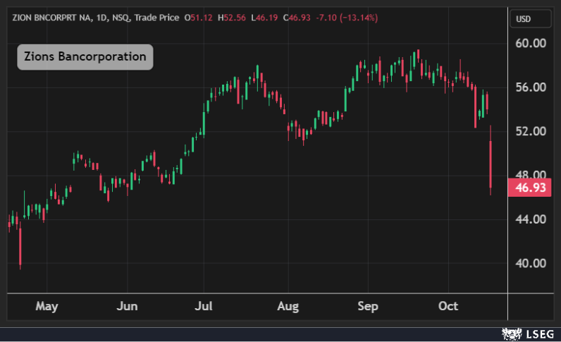 هبطت أسهم Zions Bancorporation بنسبة 13% لتتكبد أكبر خسارة يومية في 6 أشهر بعد أن كشف البنك الإقليمي عن خسارة غير متوقعة في قرضين في فرعه بكاليفورنيا، مما زاد من قلق المستثمرين المتزايد بشأن ضغوط الائتمان الخفية، في الوقت الذي يواجه فيه المقرضون حالة من عدم اليقين الاقتصادي مع استمرار ارتفاع معدلات الفائدة نسبياً.