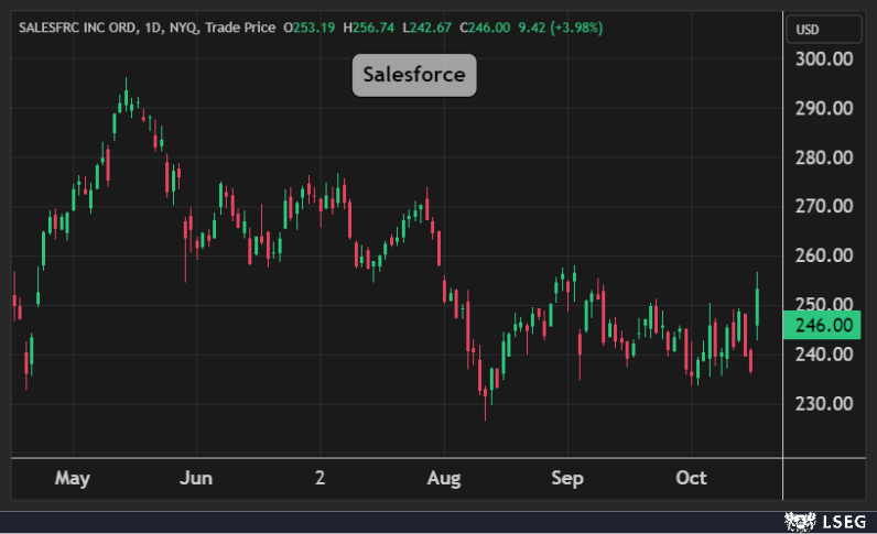 قفز سهم Salesforce بنحو 4% في جلسة الخميس مسجلاً أعلى مكاسب يومية في 5 أشهر، اتضيف الشركة 9 مليارات دولار إلى قيمتها السوقية في يوم واحد.