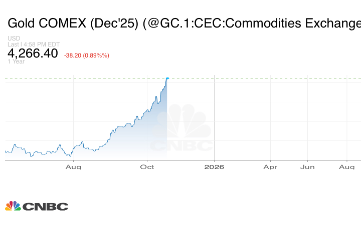 وانخفضت العقود الأميركية الآجلة للذهب تسليم ديسمبر / كانون الأول 0.89% إلى 4266.40 دولار عند التسوية.