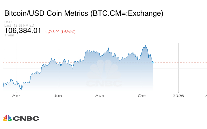 بعد أسبوع من هبوط كبير محا مليارات الدولارات من القيمة السوقية للأصول الرقمية، تواصل عملة بتكوين التراجع، اليوم الجمعة 17 اكتوبر/ تشرين الأول، وسط استمرار التوترات التجارية وترنح الأسواق العالمية تحت وطأة المخاوف المتصاعدة في الأسواق العالمية.