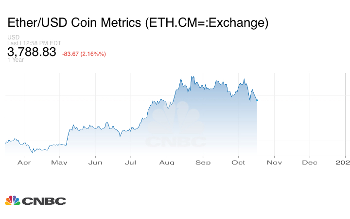وانخفض سعر الإيثريوم، ثاني أكبر العملات المشفرة، بنسبة 2.16% إلى 3788.83، لتتراجع بنحو 25% عن ذروتها في أغسطس الماضي.