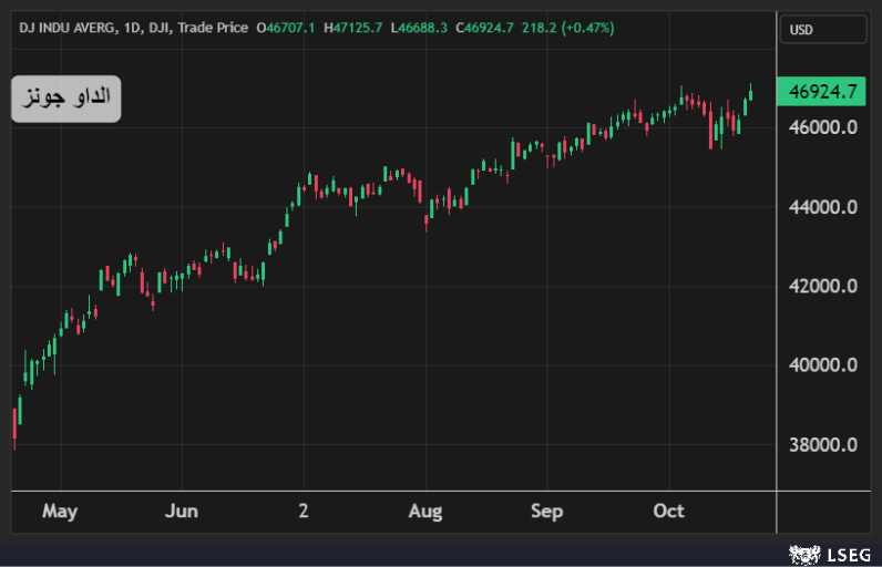 ارتفع مؤشر الداو جونز بنسبة 0.5% أي ما يعادل 218 نقطة في يوم الثلاثاء مسجلاً ثالث مكاسب يومية على التوالي، ليسجل إغلاقاً قياسياً جديداً فوق مستويات 46900 نقطة.