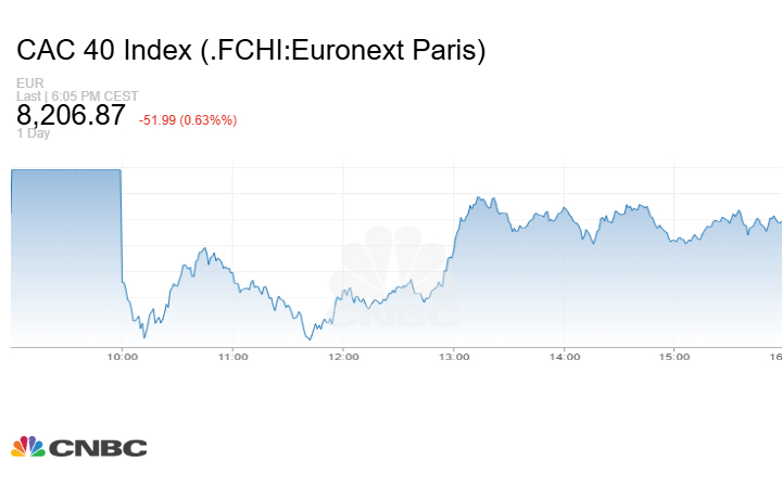 في حين تراجع مؤشر CAC 40 الفرنسي بنحو 51.99 نقطة أو بنسبة 0.63% عند الإغلاق إلى مستوى 8206.87 نقطة.