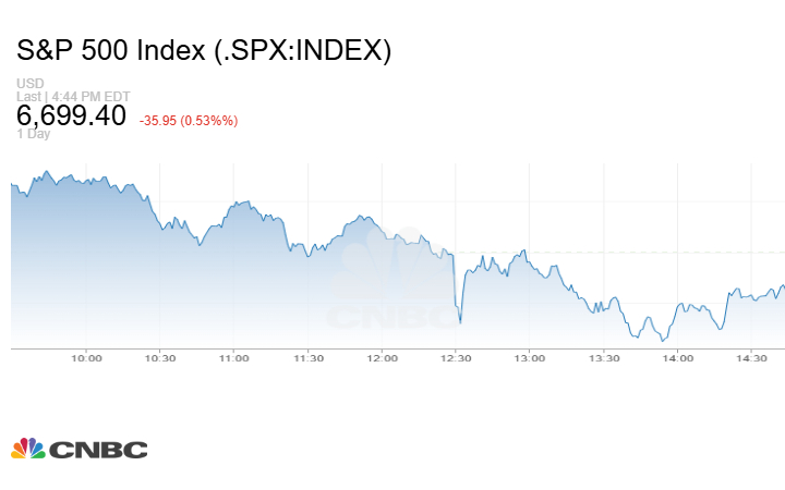 كما أغلق مؤشر S&P 500 التعاملات على هبوط 35.95 نقطة أو بنسبة 0.53% إلى 6699.40 نقطة.