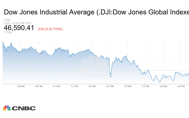 انخفض مؤشر Dow Jones الصناعي بنحو 334.33 نقطة أو بنسبة 0.71% عند إغلاق تعاملات الأربعاء إلى 46590.41 نقطة.