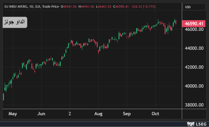 تراجع مؤشر الداو جونز بنسبة 0.7% أي ما يعادل 334 نقطة في يوم الأربعاء ليهبط من ذروته القياسية