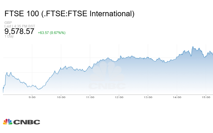 وصعد مؤشر FTSE 100 البريطاني 63.57 نقطة أو بنسبة 0.67% عند الإغلاق إلى مستوى 9578.57 نقطة.