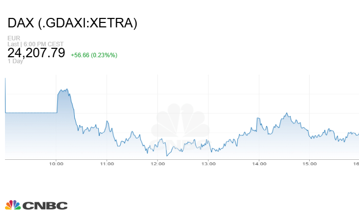 كما أغلق مؤشر DAX الألماني الجلسة على صعود 56.66 نقطة أو بنسبة 0.23% إلى مستوى 24207.79 نقطة.