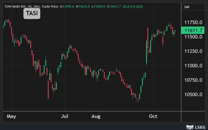 ارتفع مؤشر تاسي بنسبة 0.2% في جلسة الخميس ليستعيد مستويات 11600 نقطة بدعم من ارتفاع سهمي سابك وأكوا باور بنسبة 0.6% و0.3% على التوالي.