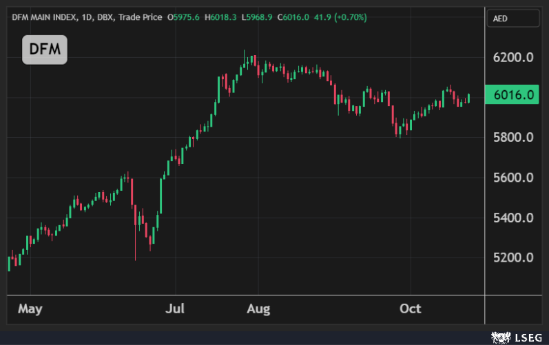 وفي سوق دبي، ارتفع المؤشر العام بنسبة 0.7% في جلسة الخميس بدعم من ارتفاع سهم الإمارات دبي الوطني بنسبة 1.8% محققاً أعلى إغلاق يومي في تاريخه.