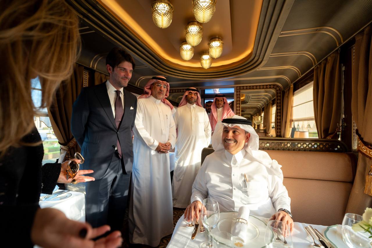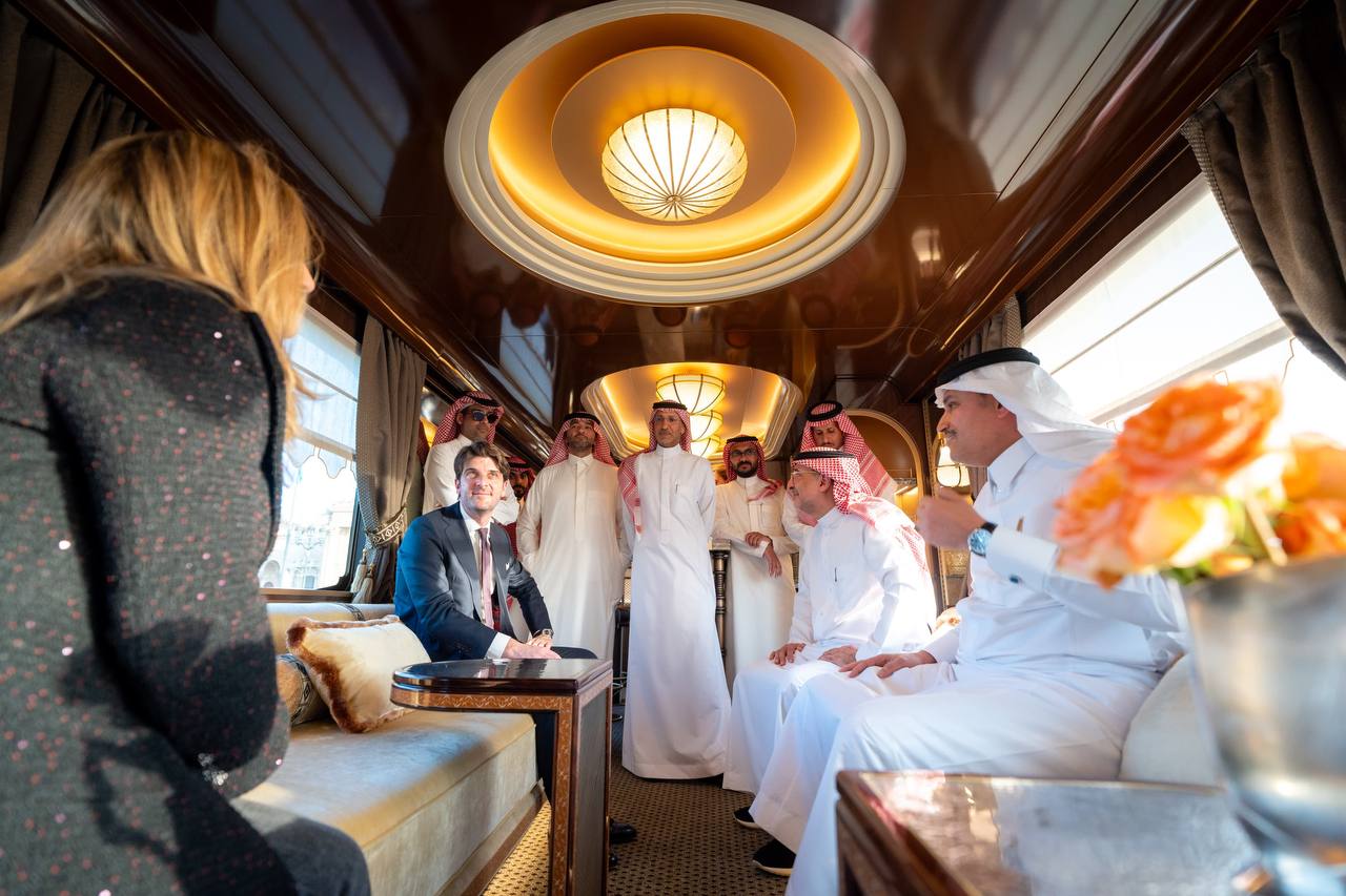 وتضم عربات القطار أيضًا صالة مجلس مميزة بطابع معماري فاخر، تتزين بلمساتٍ من الخشب وألوانٍ مستوحاة من طبيعة الصحراء السعودية، بالإضافة إلى تفاصيل ذهبية تعكس التراث السعودي.