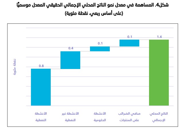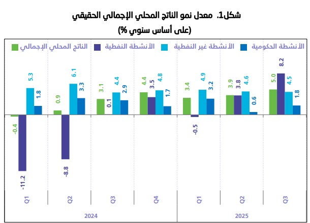 أما على أساس ربعي، فقد نما الناتج المحلي الإجمالي الحقيقي المعدل موسمياً بنسبة 1.4% مقارنة بالربع السابق، بدعم من ارتفاع الأنشطة النفطية بنسبة 3.1%، وغير النفطية بنسبة 0.6%، والأنشطة الحكومية بنسبة 0.7%.