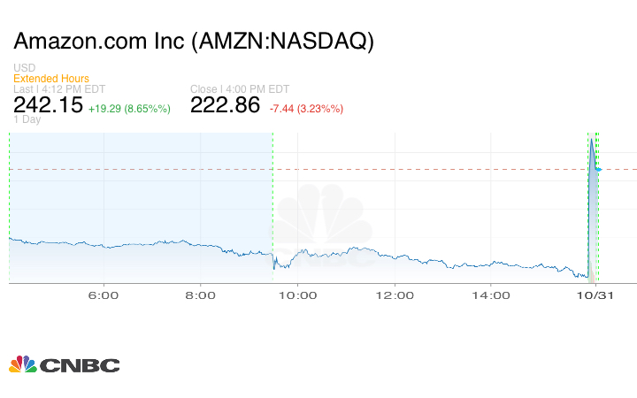 وقفزت أسهم أمازون بأكثر من 10% في التداولات الممتدة يوم الخميس بعد أن أعلنت الشركة عن أرباح الربع الثالث التي تجاوزت التوقعات ونمو قوي في السحابة.