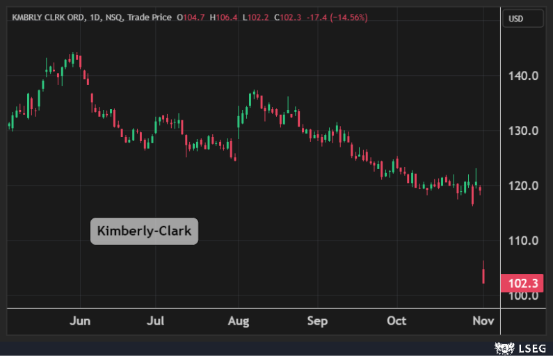 هبطت أسهم Kimberly-Clark بنسبة 15% في جلسة الإثنين ليتكبد أكبر خسارة يومية منذ عام 1987 .