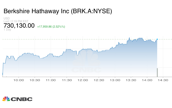 ارتفعت أسهم Berkshire Hathaway من الفئة أ بنسبة 2.6% يوم الثلاثاء، حيث سعى المستثمرون إلى الأمان خلال موجة البيع الواسعة في السوق، بفضل حجم الشركة القابضة المترامية الأطراف واستقرارها.