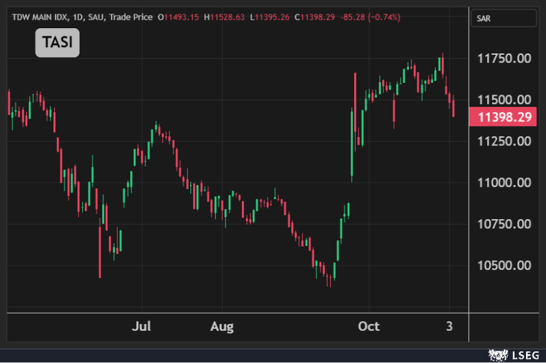 وجاء هذا الضغط بشكل رئيسي من انخفاض سهم مصرف الراجحي بنسبة 1.5% مسجلاً أدنى إغلاق يومي في شهر.