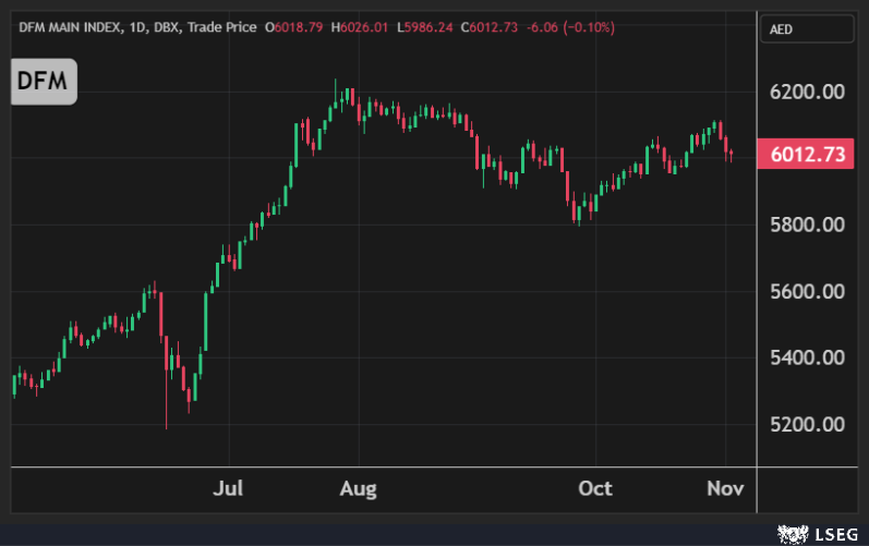 وفي سوق دبي، تراجع المؤشر العام بنسبة 0.1% في جلسة الإثنين مسجلاً ثالث خسارة يومية على التوالي متأثراً بانخفاض سهم الإمارات دبي الوطني بنسبة 2.7%.