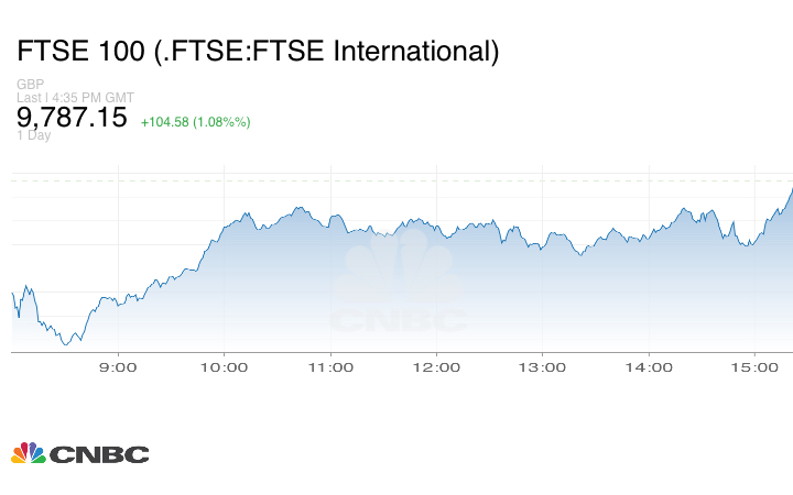 ارتفع مؤشر فوتسي البريطاني بنسبة 1% إلى 9.787.15 عند الإغلاق.