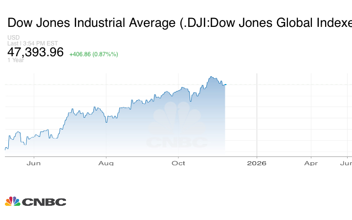 وعند الإغلاق، ارتفع مؤشر داو جونز الصناعي 404 نقطة، أو 0.9% إلى 47.393.96 نقطة.