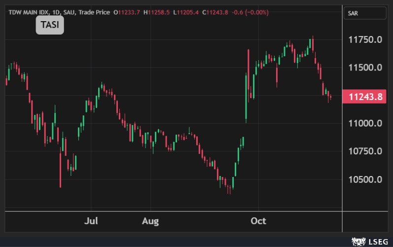 أغلق مؤشر تاسي مستقراً دون تغيير عند مستويات 11243 نقطة في يوم الإثنين وسط تباين أداء القياديات مع انخفاض سهم مصرف الراجحي بنسبة 1.2% مقابل ارتفاع سهم أرامكو بنسبة 0.9%.