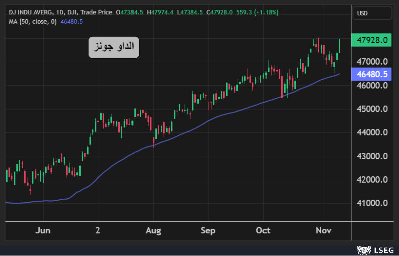 ارتفع مؤشر الداو جونز بنسبة 1.2% أي ما يعادل 559 نقطة في يوم الثلاثاء مسجلاً إغلاقاً قياسياً جديداً.