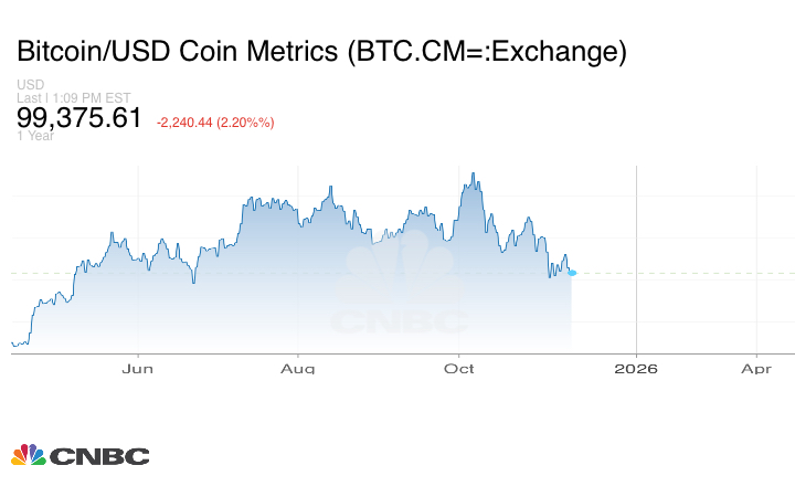 انخفضت بتكوين 2.2% إلى 99.375.61 دولاراً، بينما شهدت العملات الرقمية الكبرى الأخرى خسائر أكثر حدة، وفقاً لبيانات موقع كوين ماركت كاب.