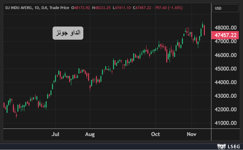 تراجع مؤشر الداو جونز بنسبة 1.65% أي ما يعادل قرابة 800 نقطة في يوم الخميس مسجلاً أكبر خسارة يومية في شهر.