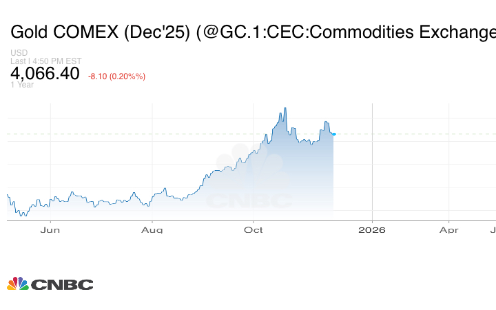 وانخفضت العقود الآجلة للمعدن الأصفر تسليم ديسمبر بنسبة 0.2% أو ما يعادل 8 دولارات إلى 4066.5 دولار للأونصة.