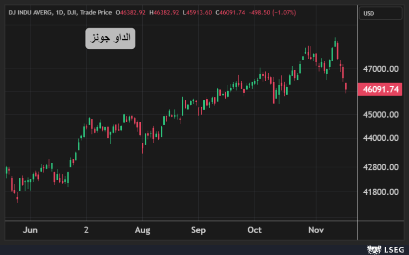 تراجع مؤشر الداو جونز بنسبة 1.1% أي ما يعادل نحو 500 نقطة في جلسة الثلاثاء لتتجاوز خسائر المؤشر 2100 نقطة في آخر 4 جلسات.