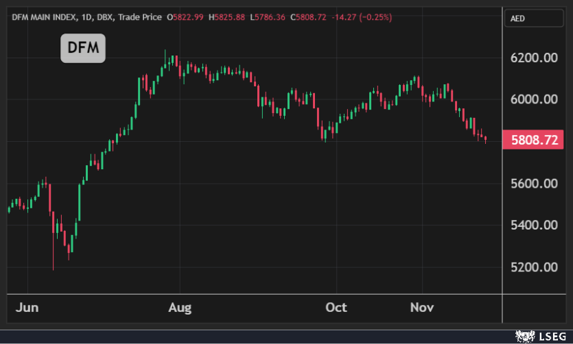 وفي سوق دبي، تراجع المؤشر العام بنسبة 0.25% مسجلاً رابع خسارة يومية على التوالي وأدنى إغلاق يومي في نحو 5 أشهر متأثراً بانخفاض سهمي سالك والإمارات دبي الوطني بنسبة 0.7% و0.2% على التوالي.