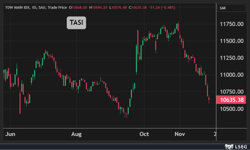 تراجع مؤشر تاسي بنسبة 0.5% في جلسة الأربعاء مسجلاً ثالث خسارة يومية على التوالي ويغلق عند أدنى مستوياته في أكثر من شهرين.