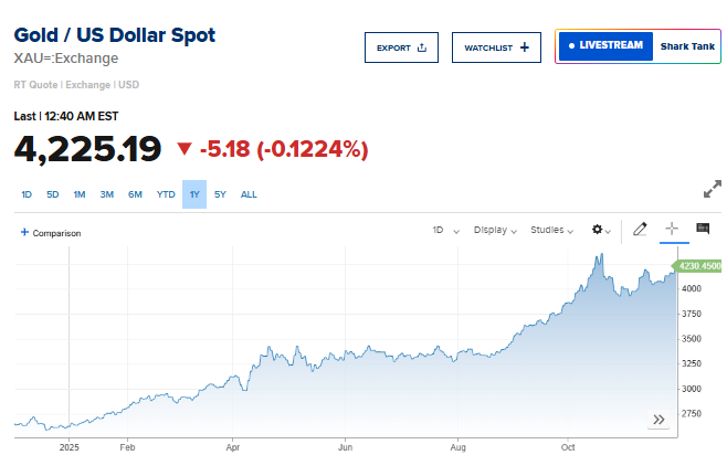 انخفض الذهب في المعاملات الفورية بنحو 0.1% إلى 4225.19 دولاراً للأونصة، بعدما لامس يوم الجمعة أعلى مستوياته منذ 13 نوفمبر تشرين الثاني.