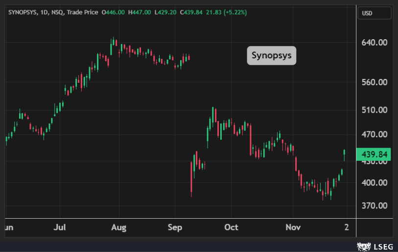 قفز سهم Synopsys بنسبة5% في جلسة الإثنين لأعلى مستوياته في شهر لتضيف الشركة نحو 4 مليارات دولارات في يوم واحد.