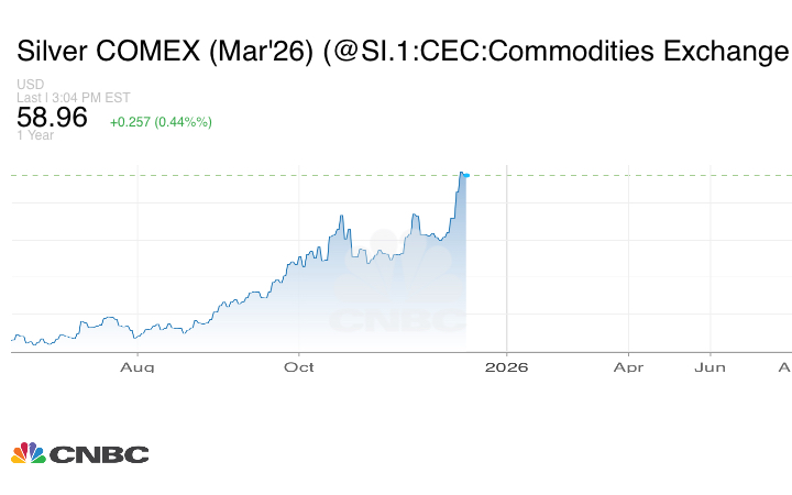 وسجّل المعدن الأبيض ارتفاعاً بنسبة 0.4% إلى 58.73 دولاراً للأونصة بعد أن لامس مستوى قياسياً جديداً بلغ 58.94 دولاراً في وقت سابق من الجلسة.