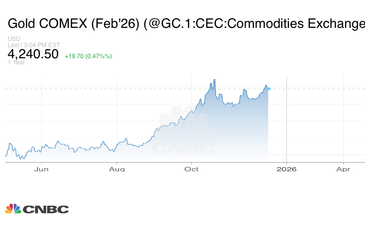 بينما ارتفعت عقود الذهب الأميركية الآجلة تسليم فبراير بنحو 0.5% لتصل إلى 4.241.20 دولار.