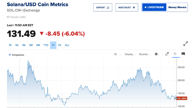 وتراجعت عملات سولانا Solana بأكثر من 6% لتسجل 131.8 دولار