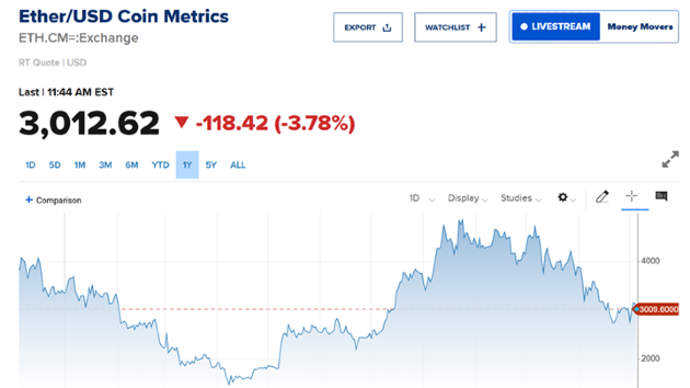 وانخفضت عملة إيثر Ether المشفرة بأكثر من 3%، لتسجل 3,016.93 دولار.