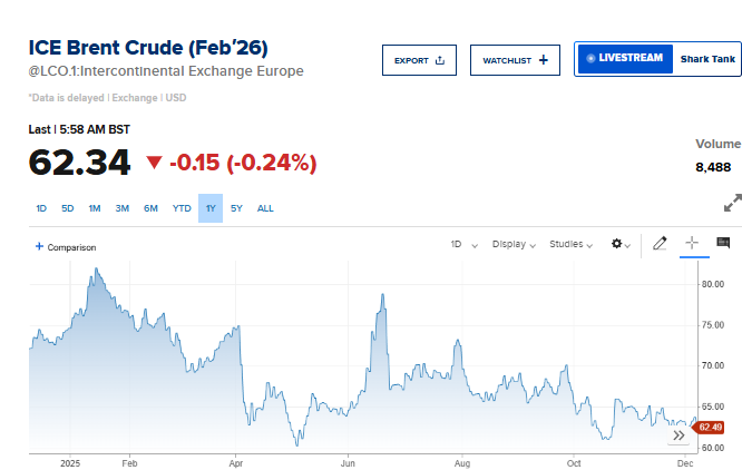 وقالت بريانكا ساشديفا، كبيرة محللي السوق في شركة فيليب نوفا، إن «تراجع سعر برنت باتجاه 62 دولاراً يتماشى تماماً مع السيناريو الأوسع لشهر ديسمبر كانون الأول»، بحسب رويترز.