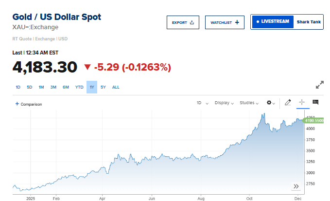 فيما استقرت العقود الأميركية الآجلة للذهب تسليم ديسمبر كانون الأول عند 4214.40 دولاراً للأونصة.