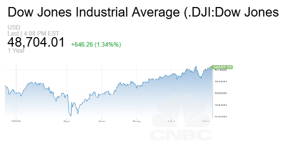 وارتفع مؤشر داو جونز الصناعي، الذي يضم 30 سهمًا، بمقدار 663 نقطة أو 1.34% مسجّلًا مستوى قياسيًا جديدًا، مدعومًا بصعود سهم فيزا بعد رفع تصنيفه في بنك أوف أمريكا.