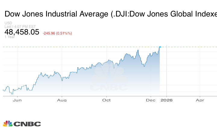 وانخفض مؤشر داو جونز الصناعي بمقدار 245.96 نقطة، أو 0.51%، إلى 48458.05 نقطة، بعد أن سجل أعلى مستوى له على الإطلاق خلال جلسة التداول.