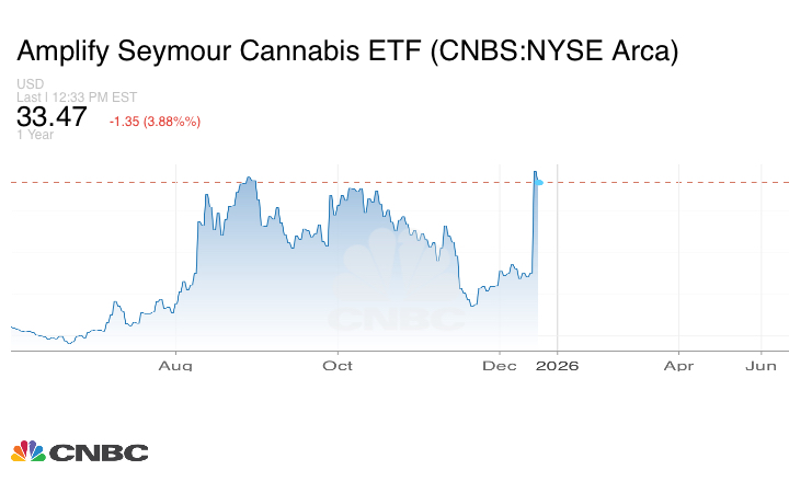 وكان المؤشر قد ارتفع بأكثر من 54% يوم الجمعة مسجلاً أفضل أداء يومي له على الإطلاق، وذلك بعد أن صرّح مصدر مطلع لشبكة CNBC بأن الرئيس دونالد ترامب قد يصدر أمراً تنفيذياً لإعادة تصنيف الماريجوانا اعتباراً من يوم الاثنين.