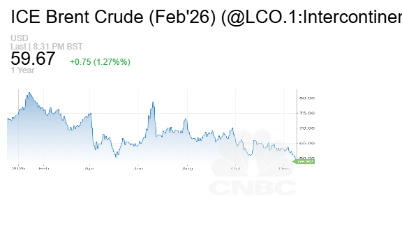 وصعدت العقود الآجلة لخام برنت ترتفع 94 سنتا أو 1.6% لتبلغ عند التسوية 59.86 دولاراً للبرميل. وذلك عقب قرار الرئيس الأميركي دونالد ترامب فرض حصار «كامل وشامل» على جميع ناقلات النفط الخاضعة للعقوبات التي تدخل فنزويلا أو تغادرها.