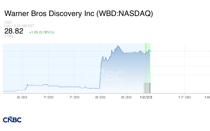 ارتفعت أسهم وارنر بروس ديسكفري Warner Bros. Discovery بأكثر من 3% بعد أن أعلنت باراماونت سكاي دانس أنها تضمن دعم لاري إليسون لعرض مُعدّل للاستحواذ على الشركة الأم لشبكة HBO.