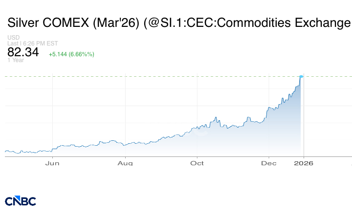 واصلت الفضة في تسجيل مكاسب خلال التعاملات المبكرة، ليل الأحد 28 ديسمبر/ كانون الأول، وارتفعت بنحو 8% عند نحو 82 دولاراً للأونصة لأول مرة.