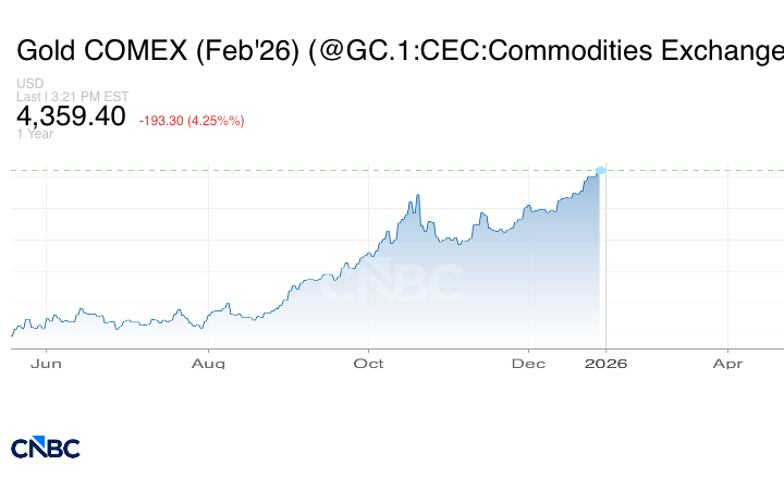 هبطت العقود الآجلة للمعدن الأصفر تسليم فبراير بنسبة 4.6% أو ما يعادل 209.1 دولار إلى 4343.60 دولار، بعدما لامس مستوى قياسياً مرتفعاً بلغ 4549.71 دولاراً يوم الجمعة.